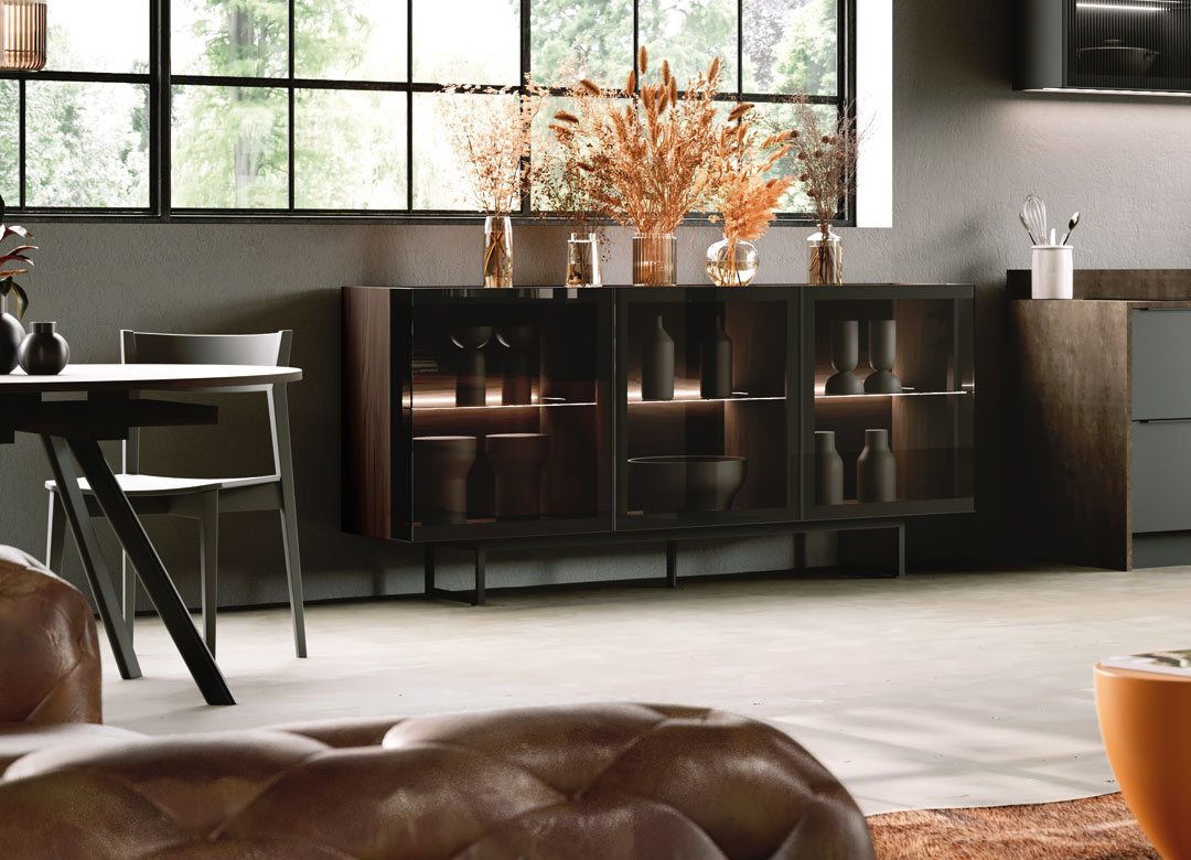 Ce buffet combine des portes en verre avec nos finitions en mélaminé effet bois. Modulable, il s’intègre parfaitement à votre salon grâce à un large choix de finitions, avec 12 teintes de bois disponibles.